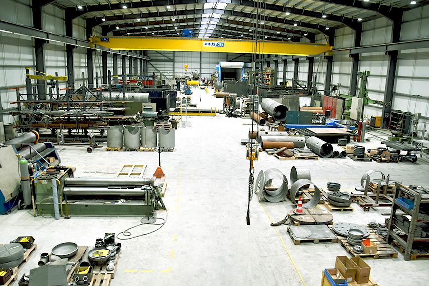 Auf dem 10.000 Quadratmeter großen Grundstück verfügt unsere Produktionshalle über eine große Arbeitsfläche von rund 4.000 Quadratmetern und ist mit einer Druckkammer (10 m lang), Lackiererei (15 m lang), Sandstrahlkammer und Brückenkränen bis zu 25t Traglast, ausgestattet. Darüber hinaus verfügen wir über einen separaten Arbeitsbereich für unsere Edelstahlproduktion.